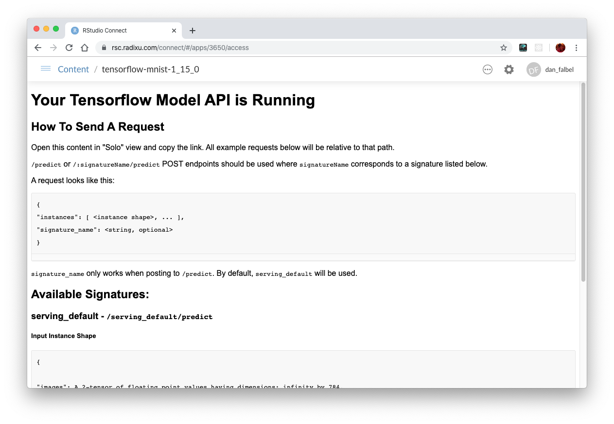 In this tutorial you will learn how to deploy a TensorFlow model to RStudio Connect. RStudio Connect uses TensorFlow Serving for performance but makes it much easier for R users to manage their deployment.