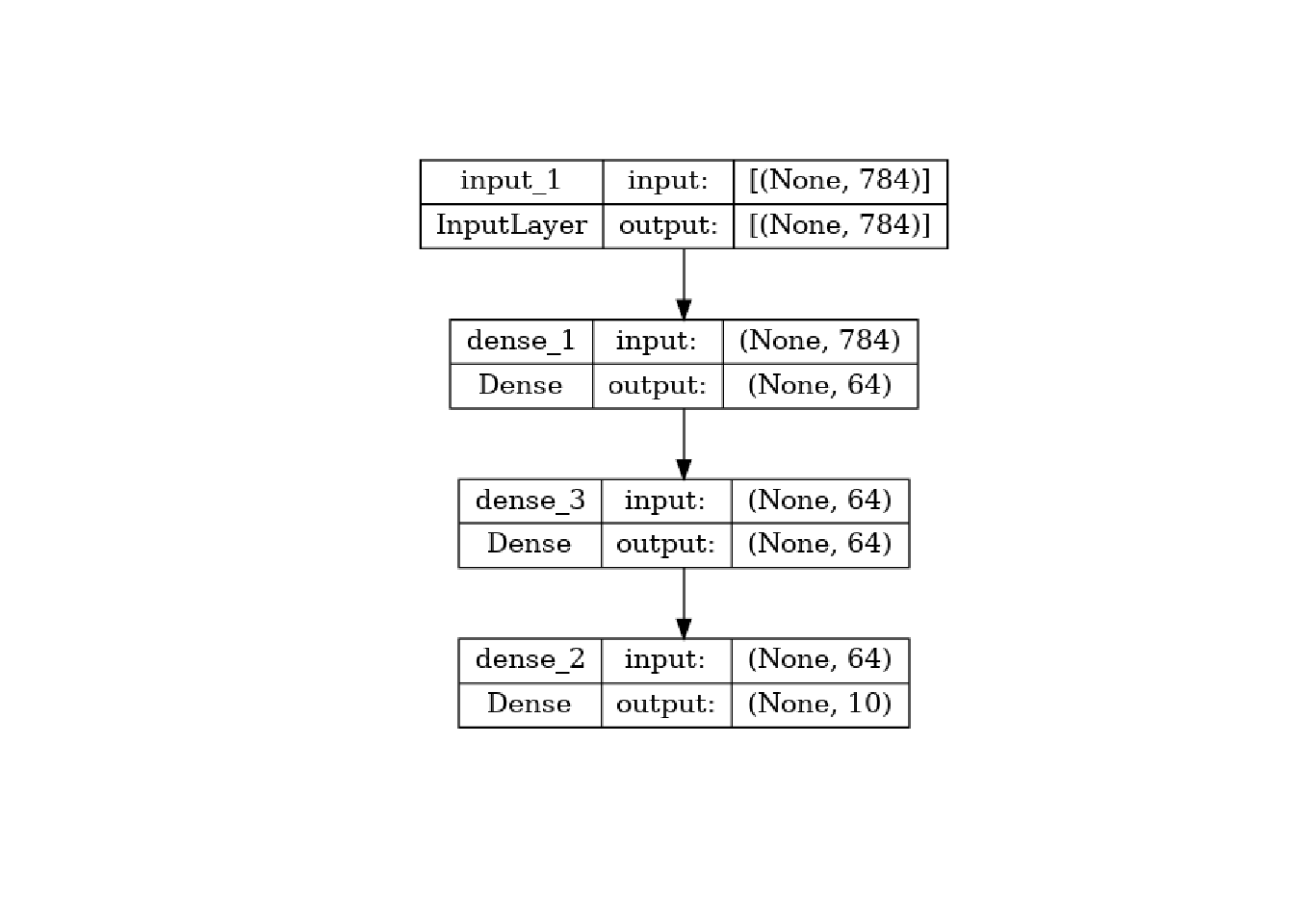 (output: logits of a probability distribution over 10 classes)This is a basic graph with three layers. To build this model using the functional API, start by creating an input node: