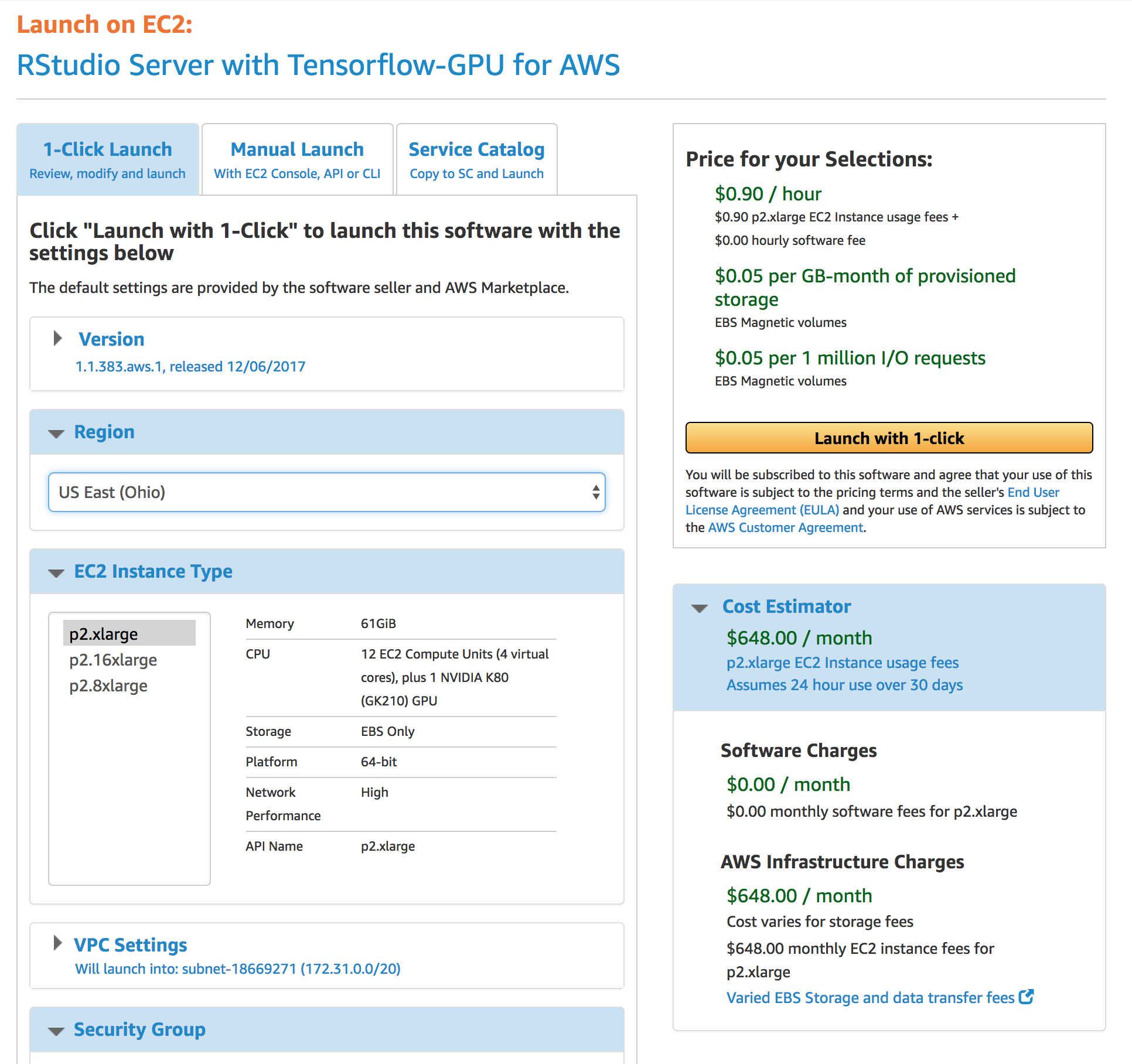 RStudio has AWS Marketplace offerings that are designed to provide stable, secure, and high performance execution environments for deep learning applications running on Amazon EC2. The tensorflow, tfestimators, and keras R packages (along with their pre-requisites, including the GPU version of TensorFlow) are installed as part of the image.