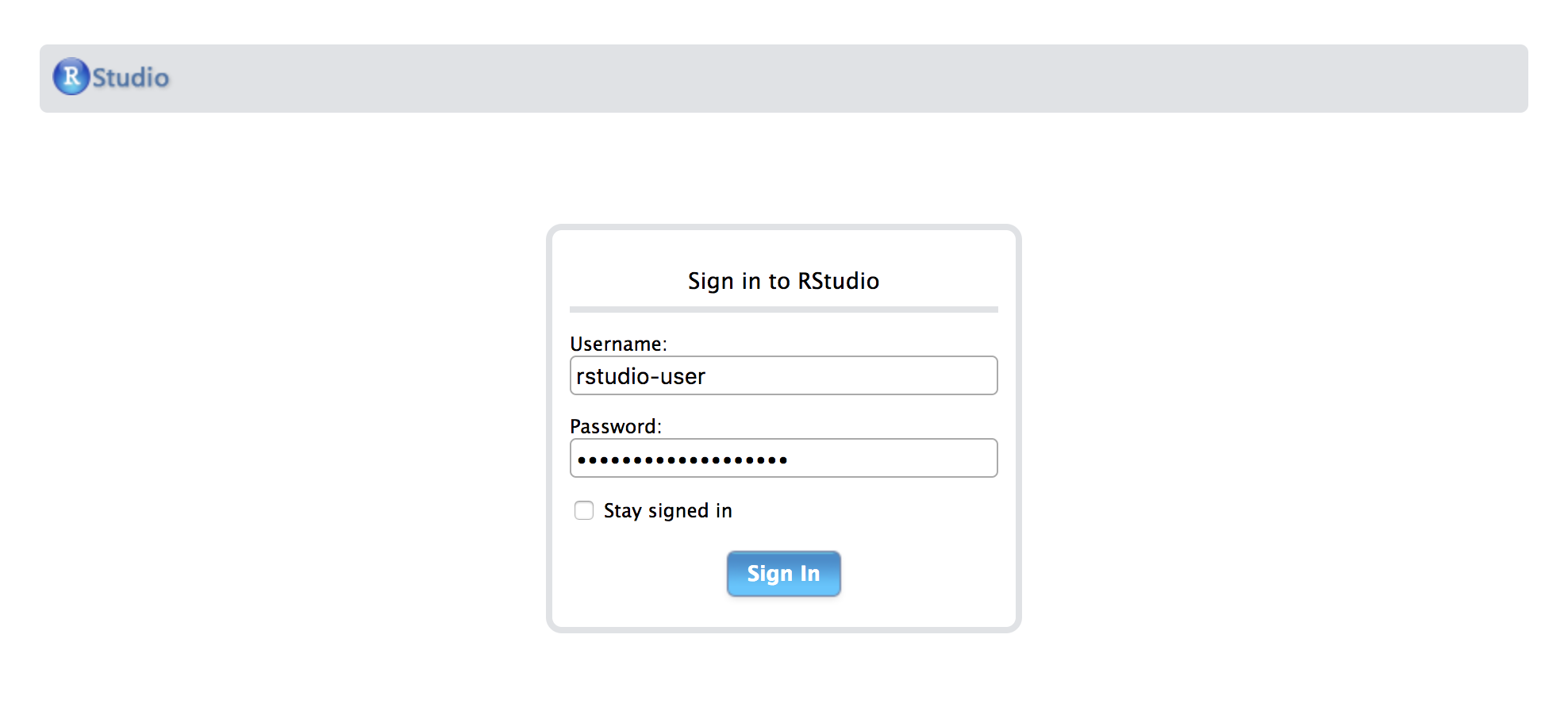 After you’ve launched the server you can access an instance of RStudio Server running on port 8787. For example: