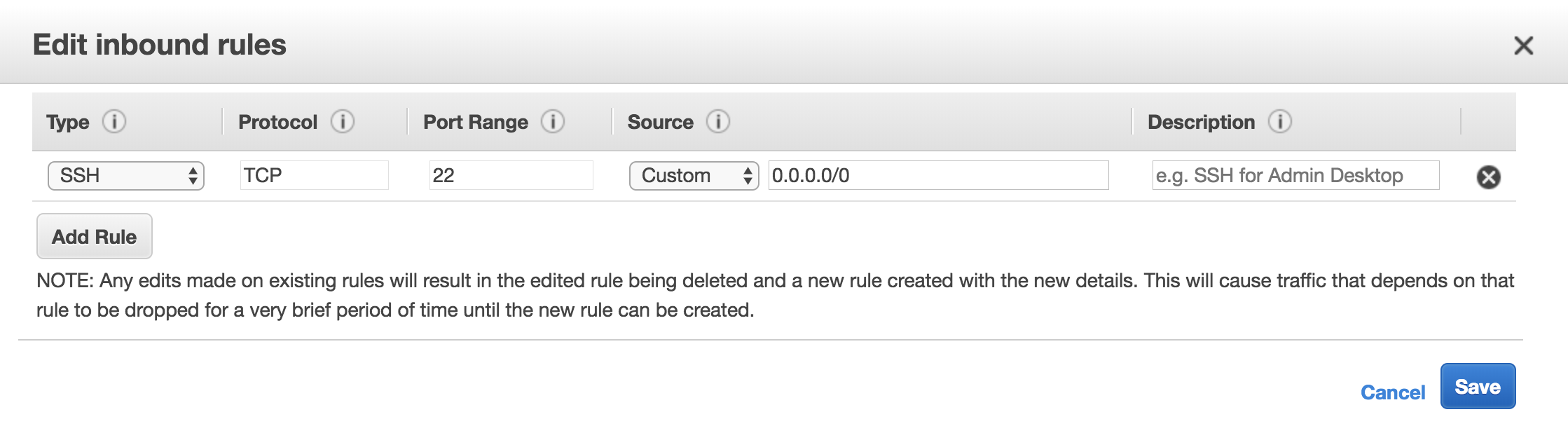 Note that you may also want to restrict the Source of SSH traffic to the specific block of IP addresses you plan to access the server from.